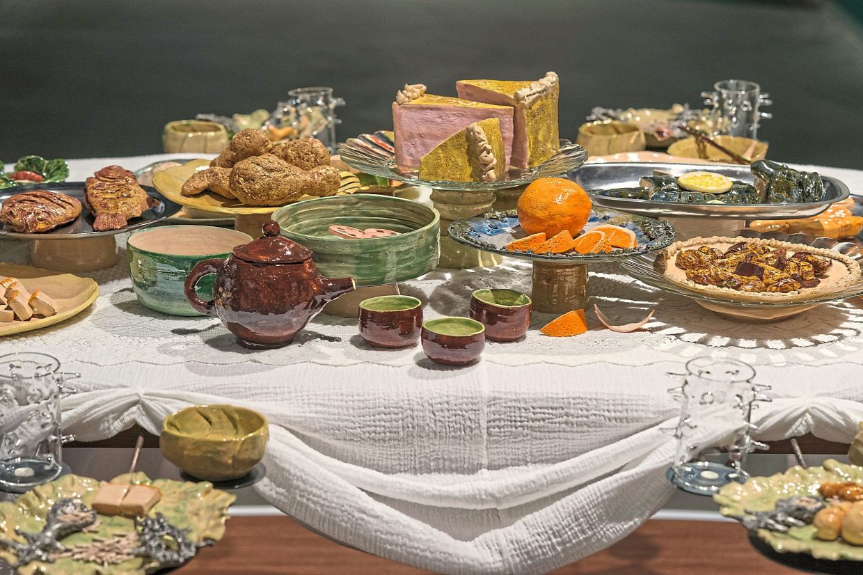 At the start of the exhibition, a dinner table installation greets visitors. Titled and here we sit, in the weight of silence, the piece by Kimberley Boudville is a handmade ceramic feast that confronts loss and grief – a courageous exploration of a rarely addressed subject in contemporary art.
